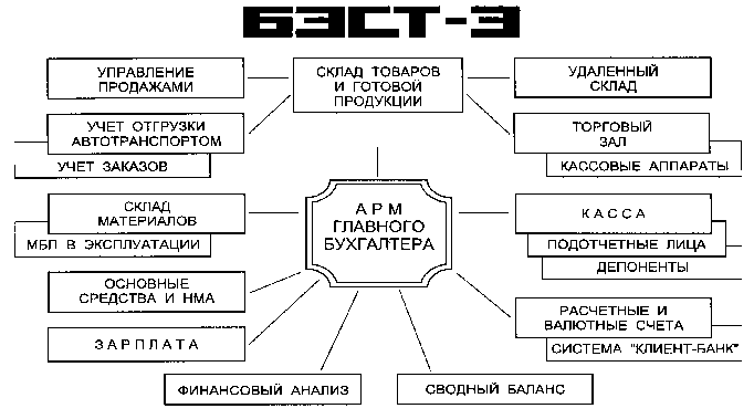 По своему функциональному назначению система “БЭСТ“ объединяет функции собственно бухгалтерского учета, и оперативного учета (модуль управления продажами). Таким образом, отдельные подсистемы могут использоваться не только работниками бухгалтерии, но и администрации, коммерческого отдела, отдела снабжения и т.д.