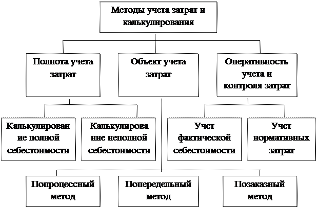 Под методом учета затрат на производство и калькулирования себестоимости продукции понимают совокупность приемов документирования и отражения производственных затрат, обеспечивающих определение фактической себестоимости продукции, а так же отнесение издержек на единицу продукции. Существуют различные методы учета затрат на производство и калькулирования себестоимости продукции. Их применение определяется особенностями производственного процесса, характером производимой продукции (оказываемых услуг), ее составом, способом обработки. Методы учета затрат и калькулирования можно сгруппировать по трем признакам: по объектам учета затрат, по полноте учитываемых затрат и по оперативности учета и контроля за затратами.