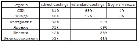Таким образом, мы видим, что помимо Германии «direct-costing» широко распространен в Канаде и Великобритании. В то время как в США и Японии его используют сравнительно мало, но, тем не менее, доля его все же значительна, она превышает 30%. Следует также учесть, что «standard-costing» обязателен для применения. Так как подавая информацию о деятельности предприятия в государственные органы надо использовать именно данный метод. Поэтому можно увидеть, насколько «direct-costing» выделяется из общей массы различных методов. Ведь, несмотря на обязательность использования «standard-costing», этот метод в некоторых странах используется на более чем 50% предприятий.