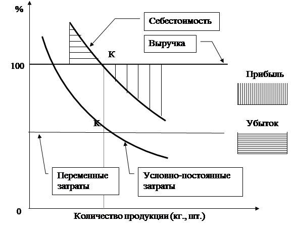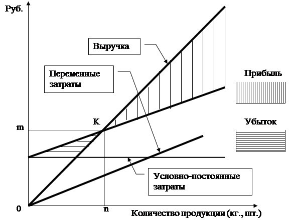 Деление затрат на постоянные и переменные позволяет четко показать зависимость между выручкой от реализации продукции, себестоимостью и размером прибыли от реализации продукции. Эта зависимость отражается с помощью графика безубыточности (рис. 1.1 и 1.2).