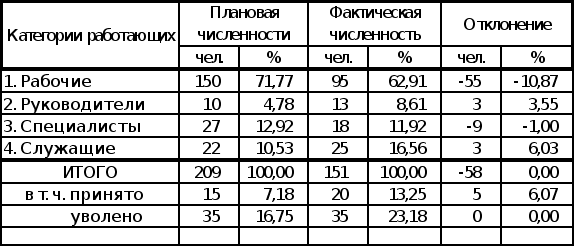 В анализируемом периоде фактическая численность работающих снизилась на 58 человека. Незначительно изменилась структура работающих – уменьшилась доля рабочих и специалистов на 10,87% и 1% соответственно, в то же время увеличилась численность руководителей (3,55%) и служащих (6,03%).