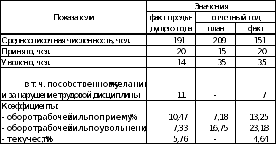 Коэффициент оборота рабочей силы по приёму увеличился на 6,07% по сравнению с плановым и на 2,78% по сравнению с предыдущим годом, а оборот рабочей силы по увольнению также увеличился на 6,43% по сравнению с плановым и на 15,85% по сравнению с предыдущим годом, на что следует обратить внимание, так как увеличение коэффициента общего оборота рабочей силы может быть следствием ухудшения условий труда.