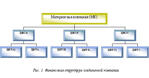 Компания холдингового типа имеет, как правило, наиболее сложные формы перечисленных структур. В частности, это несколько юридических лиц, распределенное территориальное размещение, дивизиональная либо матричная оргштатная структура. Финансовая структура включает в себя не только ЦФУ (центры финансового учета), но и более крупные центры - ЦФО (центры финансовой ответственности), которые с точки зрения управленческого учета подразумевают их выделение на самостоятельный баланс. Балансы, рассчитанные по каждому ЦФО, консолидируются в баланс всего холдинга.