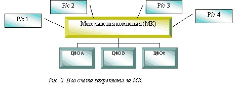 1)Все расчетные счета и кассы считаются собственностью МК, которая осуществляет оперативное управление всеми денежными потоками, принимает решения о перебросках денег между счетами, конвертациях, использовании дополнительных финансовых инструментов. Как следствие, все остатки по ним включаются в баланс МК. Кроме того, МК может взимать определенные комиссионные с каждого ЦФО за процессинг платежей.