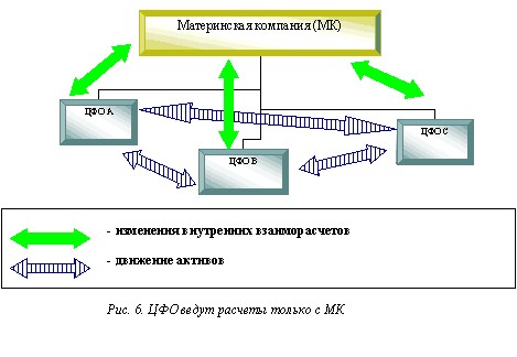 Другой вариант организации системы внутренних взаиморасчетов предполагает существование внутренних долгов только между МК и ЦФО. Сами ЦФО не учитывают взаиморасчеты с другими ЦФО.