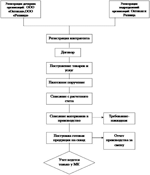 Далее показанную блок схему рассмотрим в программе «1С: Бухгалтерия 8 КОРП. Учет может вестись только у МК или когда дочерние организации выделяются на отдельный баланс. Рассмотрим первый вариант.
