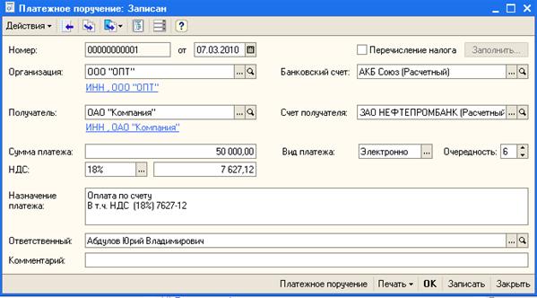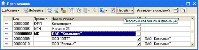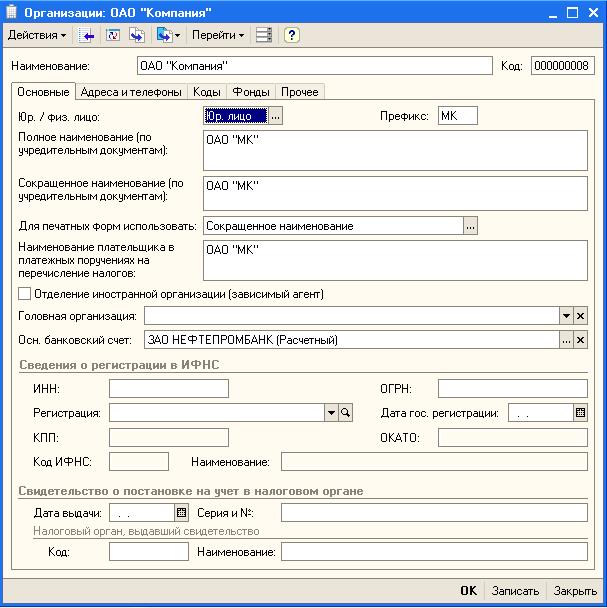 Сведения о каждом юридическом лице, учет хозяйственной деятельности которого ведется в информационной базе, вносятся в справочник Организации (меню Предприятие —» Организации).