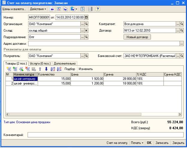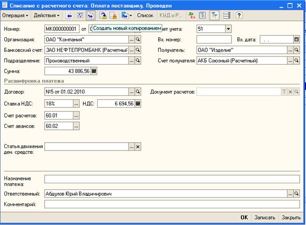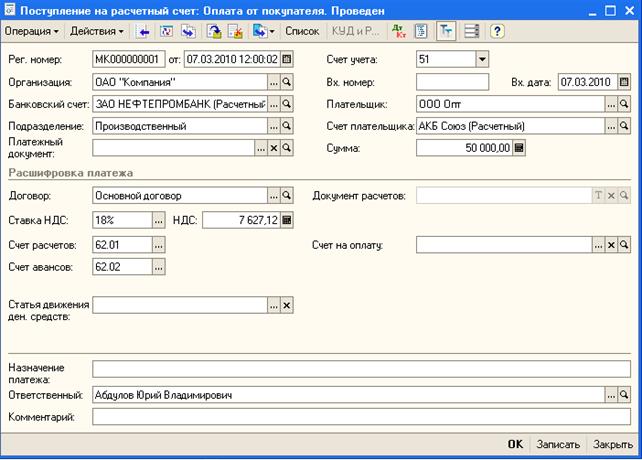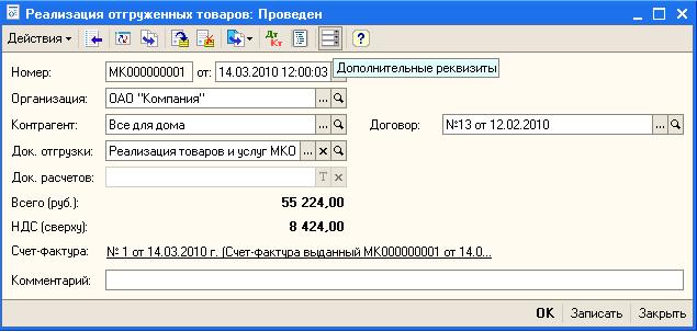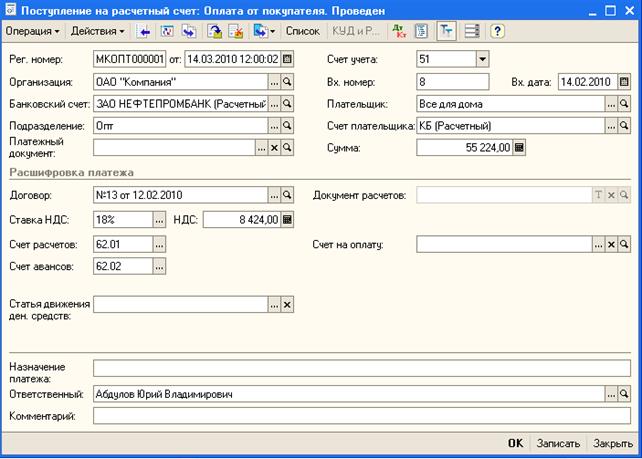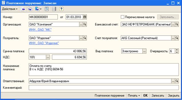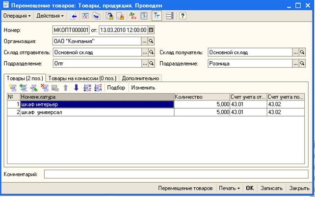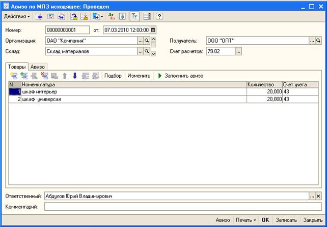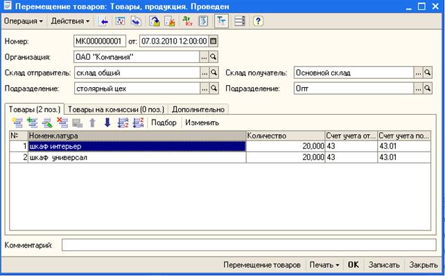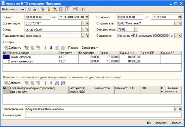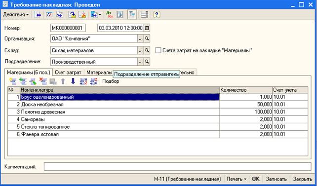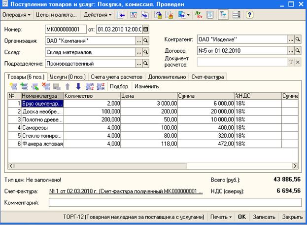 1.03.2010года ОАО «Компания» получила материалы от ОАО «Изделие» по договору №6 от 1.03.2010.Отражение материалов полученных от поставщиков отражается через документ «Поступление товаров и услуг» (Покупка/Поступления товаров и услуг/Покупка, комиссия ):