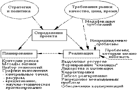 Каждый проект должен начинаться с четкой постановки цели. Поскольку окончательный успех определяется на рынке, то и цели должны быть определены рыночной потребностью. Прежде всего это рыночный сегмент и его взаимосвязанные характеристики (размер, допустимая цена, требования к технической эффективности и время вывода продукта). Продукт в свою очередь должен быть определен по своей эффективности, цене и дате появления. Все эти характеристики взаимозависимы, и, следовательно, требуется определенная итеративная процедура уточнения цели.