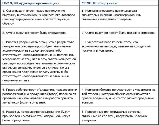 Рассмотрим подробнее, какие положения МСФО российский законодатель счел нужным внедрить в российские правила учета, и какие основные различия между двумя стандартами, ПБУ 9/99 и МСФО 18, существуют сейчас на практике.