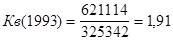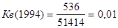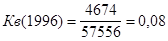 Коэффициент выбытия в 1993 году равнялся 1,91, в 94 резко снизился до 0,01 а затем немного увеличился до 0,08 в 1996 году. Можно сделать вывод - на предприятии практически не происходит обновления основных фондов.
