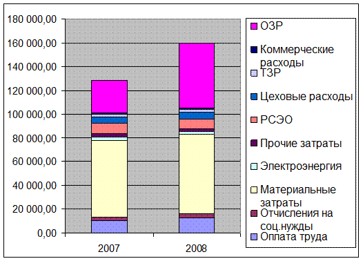В ходе проведенного анализа себестоимости автопружин было выявлено, что за период 2007-2008 гг. произошло значительное увеличение постоянных расходов (их величина возросла приблизительно в 1,6 раза), что вызвало соответствующий рост себестоимости продукции. Возросли общезаводские расходы, а именно за счет увеличения суммы налогов и сборов и заработной платы управленческого персонала.