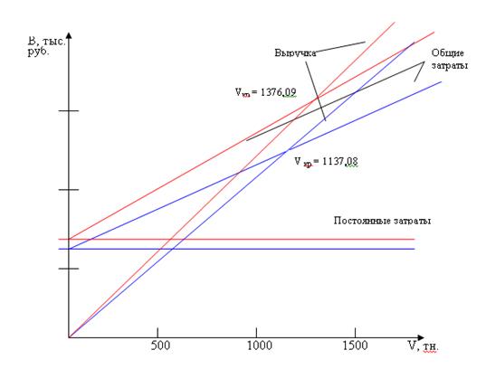 Из полученных результатов можно сделать вывод, что критический объем реализованной продукции в 2009г. составит 1137,08 тн. или 128004,69 тыс.руб. Предприятие не будет в убытке от реализации автопружин, если будет производить их с постоянными затратами не более 88 642,12 тыс.руб., переменными затратами на 1 тн. не более 73,21 тыс.руб. и по цене не менее 96,11 тыс.руб.