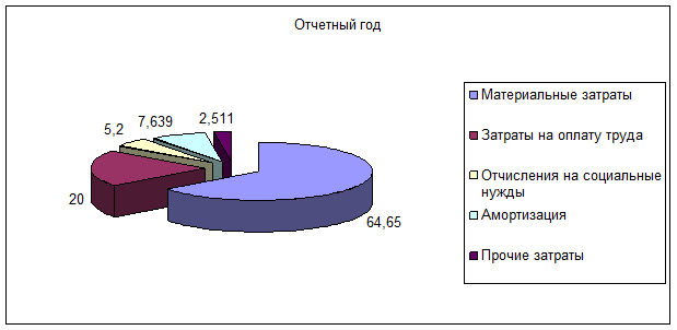 При сравнении структуры затрат на производство в отчетном году и в прошлом годом выявлено увеличение доли материальных затрат, затрат на увеличение оплаты труда, отчислений на социальные нужды и уменьшение затрат на амортизацию и прочие затраты.