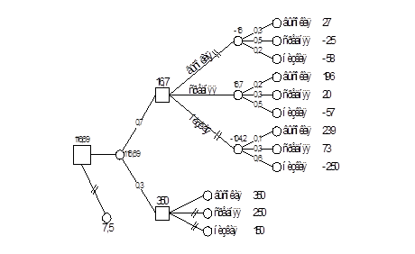 Для ветви дерева, когда конкуренция отсутствует, оптимальной для энергокомпании является высокая цена. Ожидаемая средняя прибыль в этом случае будет равна 350 млн руб. В точке первого события (внедрение продукции на конкурентном и неконкурентном рынках) средний ожидаемый выигрыш составит: