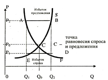 Рис.1.1 Кривые спроса и предложения. Цена равновесия