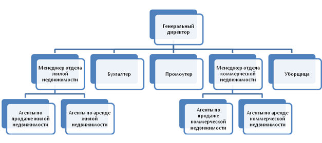 Объектом нашего исследования стало малое предприятие ООО «Национальное бюро недвижимости» (далее по тексту, НБН). Основным видом деятельности НБН являются операции с недвижимостью, к числу которых относятся продажа и аренда жилой недвижимости, а также аренда и продажа коммерческой недвижимости. Наше агентство на рынке не так давно: всего два года. Еще одной отличительной особенностью предприятия стало его местоположение. НБН располагается на севере города Москвы, в шаговой доступности от станции метро Планерная. Агентство находится на границе Москвы и Московской области. Рядом находятся такие города как Химки и Красногорск, а также район Митино. Этим фактом объясняется большое количество заказов именно на эти населенные пункты. НБН работает с понедельника по пятницу с 10.30 до 20.00 и в субботу с 12.00 до 18.00. Потребителями в основном становятся физические лица; однако среди юридических лиц тоже есть наши клиенты, чаще всего в операциях с арендой и продажей коммерческой недвижимости. В НБН работает два отдела: отдел жилой недвижимости и отдел коммерческой недвижимости, каждый из них состоит из менеджера и агентов по продаже и аренде. Чтобы более наглядно показать организационную структуру предприятия, обратимся к рис.2.1.