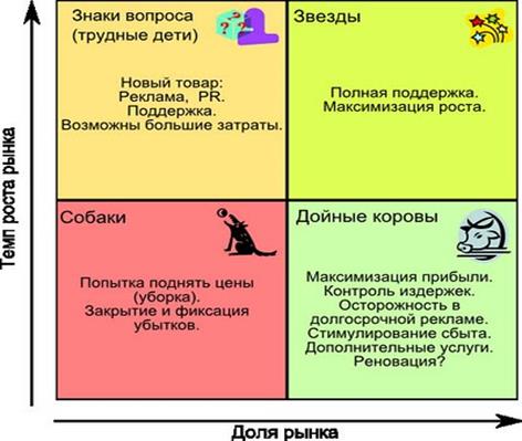 Теперь в соответствии с полученными результатами анализа деятельности предприятия, можно оценить место НБН на рынке московской недвижимости. Поможет нам в этом Бостонская матрица. Бостонская матрица - разработанная Бостонской консультационной группой таблица видов товаров, отличающихся темпом роста продаж и долей занимаемого рынка: а) "звезда" - высокий темп и высокая доля; б) "дойная корова" - низкий темп, но высокая доля; в) "трудный ребенок" - высокий темп, но низкая доля; г) "собака" - низкий темп и низкая доля [19]. Для того, чтобы более наглядно ознакомиться с Бостонской матрицей, обратимся к рисунку.