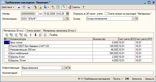 15.02 т.г. в столярный цех по требованию-накладной № 1 со склада материалов переданы материалы на производство столов обеденных. В требовании-накладной № 1 указано:
