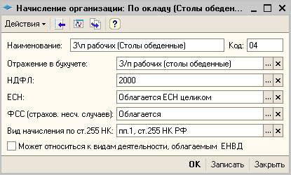 - Наименование – По окладу (Администрация), Код - 00002, Отражение в бухучете – З/п подразделения Администрация, НДФЛ – 2000, ЕСН – Облагается ЕСН целиком, ФСС – Облагается, Вид начисления по ст. 255 НК – пп.1 ст. 255 НК РФ – ОК