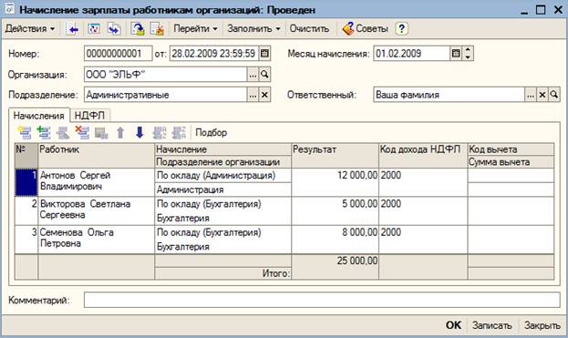 - Аналогично ввести информацию для начислений по окладу (Бухгалтерия) и по окладу (Столярный цех) с использованием метода копирования элемента.