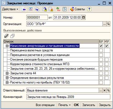 - Учет амортизационных отчислений по ОС и НМА – регистрируется документом Закрытие месяца