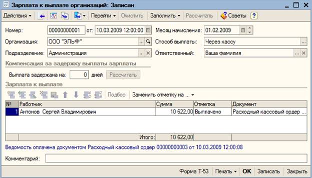 - В ведомости ;№ 1 - Заменить отметку Не выплачено на – Выплачено – Записать - Действия – На основании – Расходный кассовый ордер – Статья ДДС – Оплата труда, Счет БУ – 70 – ОК