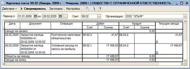 Сумма УР определяется как произведение ставки налога на прибыль на величину прибыли от основной деятельности и прочих операций, исчисленную по данным бухгалтерского учета, т.е. 87291.00 х 20% = 17458.20 – данная сумма отражается по дебету сч. 99.02 «Налог на прибыль», субсчет 99.02.1 «Условный расход по налогу на прибыль» в корреспонденции со счетом 68.04.2 «Расчет налога на прибыль».