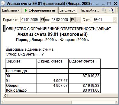 Контрольная цифра: 83011.66 – налогооблагаемая база по налоговому учету за февраль (Отчеты – Карточка счета (налоговый учет)) – сч.99.01, Вид учета НУ.