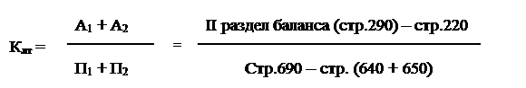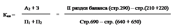 | А1 – наиболее ликвидные активы – денежные средства организации и краткосрочные финансовые вложения (ценные бумаги) | П1 – наиболее срочные обязательства: кредиторская задолженность, ссуды, не погашенные в срок (из формы №5) | А1 ≥ П1 |
