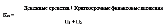 ((Денежные средства) + (Текущие финансовые вложения) + (Краткосрочная дебиторская задолженность)) / Текущие обязательства, или стр.(250 + 260 + 240) / (610 + 620 + 630 +660)