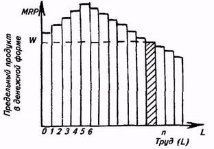 Предельный продукт n-й работницы (он заштрихован) соответствует заработной плате (W). Предельная производительность n-го работника является мерой вклада труда (L) в производство продукта. Здесь действует принцип конкурентного поведения: хозяйствующий субъект в рыночной экономике должен постоянно сравнивать свои предельные доходы и предельные издержки. Предельные издержки в данном случае — это заработная плата, которую выплачивает предприниматель, а предельные доходы — это предельный продукт в денежной форме, создаваемый каждой дополнительной единицей труда.