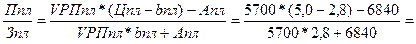 Ппл = VРПпл * (Цпл – bпл) – Апл = 5700 * (5,0 – 2,8) – 6840 = 5700 тыс.руб.