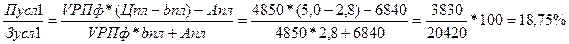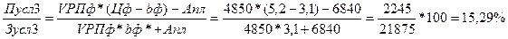 Пусл3 = VРПф * (Цф – bф) – Апл = 4850 * (5,2 – 3,1) – 6840 = 3345 тыс. руб.