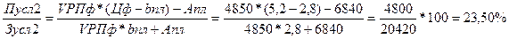 Пусл1= VРПф * (Цпл – bпл) – Апл = 4850 * (5,0 – 2,8) – 6840 = 3830 тыс. руб.