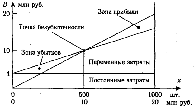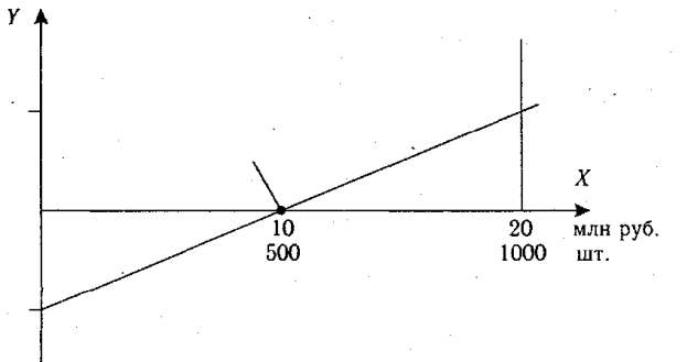 Полученную зависимость можно представить по-другому (рис. 18.3). При объеме реализации, равном нулю, предприятие получает убыток в размере суммы постоянных расходов (в нашем примере 4 млн руб.). При объеме 1000 изделий прибыль составит 4 млн руб. Соединив эти точки между собой, получим на линии X точку критического объема продаж. В данном случае точка окупаемости (порог рентабельности) будет на отметке 500 ед. или 10 млн руб. Получен тот же результат, только более простым способом.
