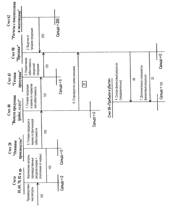 Схема бухгалтерских записей при использовании нормативного метода учета затрат и калькулирования (экономия), руб.