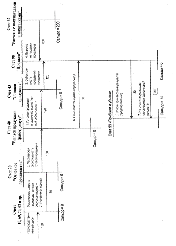 Как уже было отмечено ранее, учет затрат ведется по установленным нормативам, отклонение фактических затрат от нормативных фиксируется отдельно. В данном случае нормативная себестоимость готовой продукции, изготовленной за отчетный период, составила 120 руб. (проводка 1). В этой же оценке списана себестоимость реализованной продукции (проводка 2). Остатков готовой продукции на складе нет. Выручка от реализации продукции – 200 руб. (проводка 3), следовательно, предварительно выявленный финансовый результат составляет 80 руб. (проводка 4). Отклонения фактических затрат от нормативных учитываются отдельно и относятся на себестоимость продукции. Информация о фактической себестоимости готовой продукции собирается по дебету счета 40 (проводка 5). В данном случае сумма фактических затрат составила 100 руб.