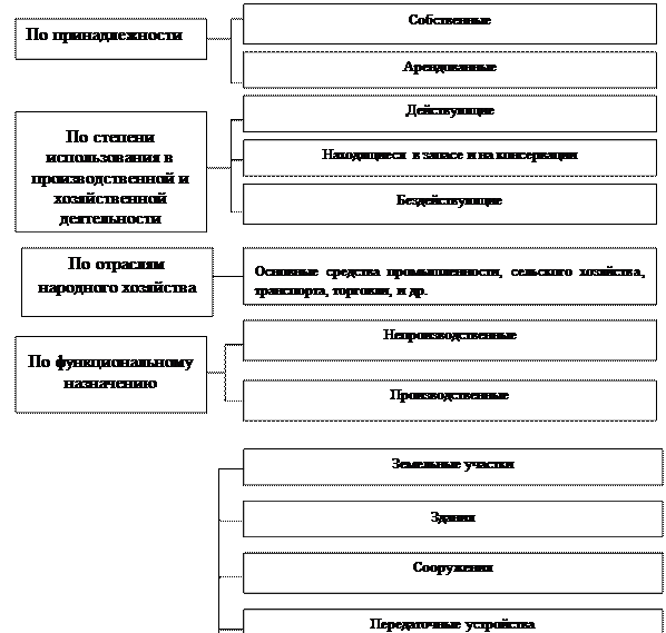Таким образом, различные авторы дают неоднозначные трактовки понятия основных средств. В зависимости от выбранной цели, основные средства можно классифицировать по различным признакам: по принадлежности, по степени использования в производственной и хозяйственной деятельности, по отраслям народного хозяйства, по функциональному назначению, по натурально-вещественному содержанию.