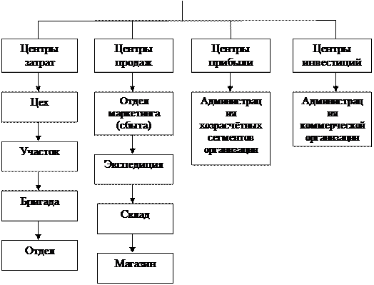 При определении центров ответственности прежде всего необходимо принимать во внимание технологическую структуру предприятия, а затем выделять её горизонтальный и вертикальный разрезы. Первый ограничивается кругом деятельности каждого лица, ответственного за центр. Второй предопределяет иерархическую лестницу правомочий лиц, принимающих управленческие решения. Каждый из центров ответственности может быть центром или затрат, или доходов, или прибыли, или инвестиций. В первом случае отчёт составляют по расходам, во втором – по объёму продаж (выручке), в третьем – по прибыли и в четвёртом – по объёму и срокам окупаемости инвестиций. Руководитель центра должен нести финансовую ответственность за принятие обязательств по выполнению заданий. При этом каждый центр может выполнять самые различные функции.