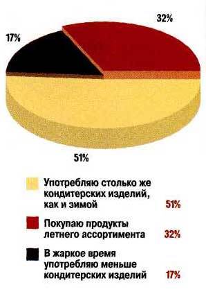 При проведении опроса покупателей было выявлено, что только 17% конечных потребителей переходят в теплое время года на продукты "летнего ассортимента", к которому относятся, например, мороженое или торты-мороженое (рис. 3). Кроме того, 32% опрошенных отмечают, что в жаркое время года они в целом покупают меньше продуктов питания, и в частности меньше кондитерских изделий.