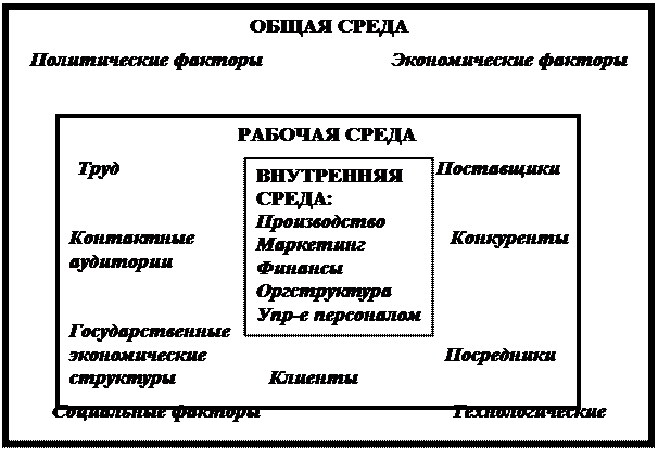 Обычно выделяются внутренняя и внешняя среда системы Внутренняя среда предприятия (компании) (рис.1) включает в себя такие компоненты как производство, финансы, маркетинг, управление персоналом. Внешняя среда компании (рис.1) подразделяется на рабочую среду (микросреду , охватывающую участников рынка, с которыми у компании имеются прямые отношения: поставщики, клиенты, посредники, конкуренты) и общую среду (макросреду , определяющую «экологию фирмы» или «предпринимательский климат», т.е. среду косвенных контактов компании, которые оказывают влияние на формирование общей атмосферы бизнеса – международное окружение, политика, экономика, технологии, социо-культурные факторы) [3, 18, 31, 67, 110, 123].