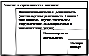 Предпринимательская деятельность компании на внешних рынках может осуществляться в различных видах [38, 78, 90, 91] (рис.2). Так по масштабам деятельности (степени охвата рыночной территории) выделяются: 1) экспорт – импорт; 2) внешнеторговая деятельность; 3) внешнеэкономическая деятельность (помимо экспорта-импорта товаров и услуг сюда также включается вывоз-ввоз капитала, научно-техническое сотрудничество, инжиниринговые и консалтинговые услуги, торги, аукционы и т.п.); 4) участие в стратегических альянсах, 5) собственно международная предпринимательская деятельность (организация бизнеса за рубежом в форме открытия филиалов, собственных предприятий и пр.). В настоящей диссертации особое внимание уделено последнему виду деятельности.