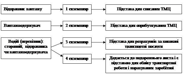- перший, другий, третій і четвертий примірники, завірені підписами і печатками (штампами) відправника вантажу, передають водію: перший примірник водій здає одержувачу, він є підставою для оприбуткування товарно-матеріальних цінностей в одержувача; другий, третій примірники, завірені підписами і печатками (штампами) одержувача, водій передає виробнику (постачальнику); четвертий примірник, який є підставою для розрахунків за виконання транспортних послуг, водій передає перевізнику.