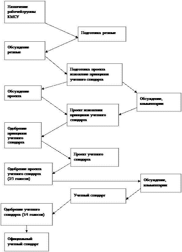 Создание учетного стандарта начинается с формирования специальной рабочей группы, члены которой назначаются правлением. Задача этой группы заключается в изучении имеющихся проблем и в подготовке краткого резюме тех вопросов, которые нуждаются в первоочередном решении. Резюме передается для рассмотрения в правление КМСУ. Правление готовит комментарии по нему и передает их, после чего рабочая группа готовит следующий документ -проект изложения принципов учетного стандарта. Предназначением этого документа является установление тех идей, которые будут положены в основу учетного стандарта, а также описание возможных путей решения проблем и обоснование причин, по которым проект стандарта может быть одобрен или отправлен на доработку. Проект изложения принципов учетного стандарта передается для обсуждения и комментариев правлению КМСУ, его консультативной группе и другим заинтересованным организациям. После сбора рекомендации рабочая группа готовит окончательный вариант проекта изложения принципов учетного стандарта, в котором свое отражение находят замечания, пожелания и комментарии, полученные в результате обсуждения. Он передается для одобрения в правление КМСУ.