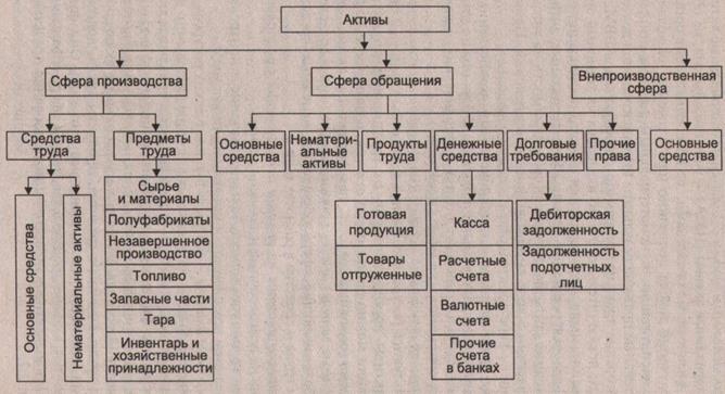 Все активы организации при их группировке по местам эксплуатации можно разделить на активы, используемые в сфере производства (основные средства, нематериальные активы, производственные запасы), в сфере обращения (основные средства и НМА, обслуживающие сферу обращения, денежные средства, продукты труда и средства в расчетах и др.).
