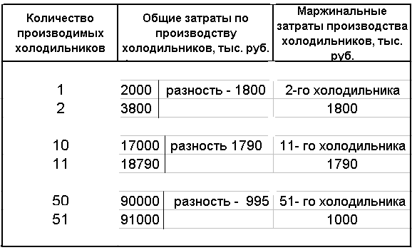 Важно различать маржинальные затраты и средние затраты. В этом примере маржинальные затраты второго холодильника составляют 1800 тыс. руб.. Однако, средние затраты на единицу, когда производятся два холодильника составляют 3800:2 = 1900 тыс.руб.. Аналогично маржинальные затраты 11-го холодильника составят 1790 тыс. руб., но средние затраты при производстве 11 холодильников равны 1708 тыс. руб. (18790 : 11).