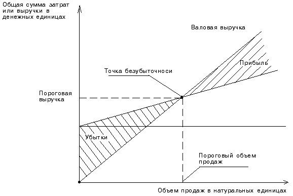 Изображенная на рис. 1 точка безубыточности (порога рентабельности) – это точка пересечения графиков валовой выручки и совокупных затрат. Размер прибыли или убытков заштрихован. В точке безубыточности получаемая предприятием выручка равна его совокупным затратам, при этом прибыль равна нулю. Выручка, соответствующая точке безубыточности, называется пороговой выручкой. Объем производства (продаж) в точке безубыточности называется пороговым объемом производства (продаж). Если предприятие продает продукции меньше порогового объема продаж, то оно терпит убытки, если больше – получает прибыль.