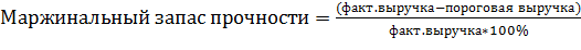 Маржинальный запас прочности — это величина, показывающая превышение фактической выручки от реализации продукции (работ, услуг) над пороговой, обеспечивающей безубыточность реализации. Этот показатель определяется следующей формулой: