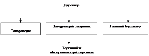 Директору подчиняются товароведы, главный бухгалтер и заведующая секциями, которым в свою очередь, подчиняются, торговый и обслуживающий персонал.